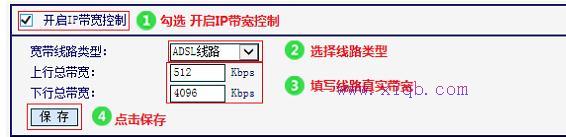 点击“IP宽带控制”——>勾选“开启IP宽带可能工作”选项——>设置“宽带线路”、“上行总宽带”、“下行总宽带”——>点击“保存”。